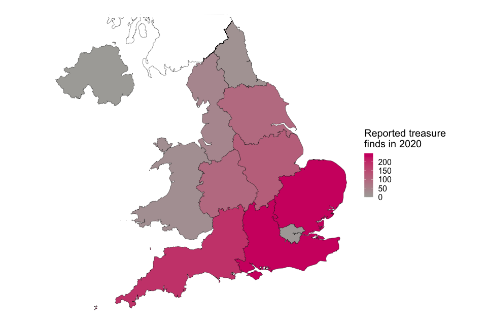 The chart below shows a geographical representation of the number of reported treasure finds in 2020 by region across England, Wales, and Northern Ireland.