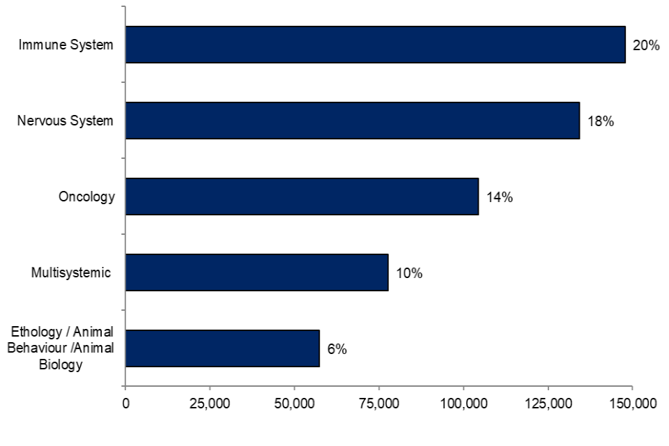 over half of experimental procedures were for basic research, the top three areas targeted in this research were the immune system, the nervous system and oncology (cancer)