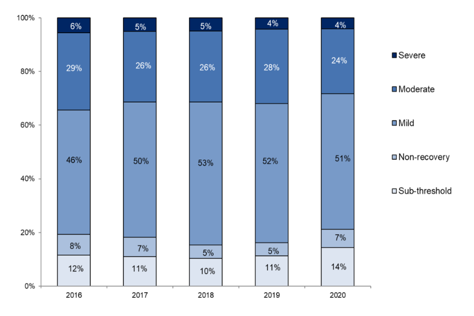 As shown in Figure 15, in 2017 there was an increase in proportion of sub-threshold. Since 2017 the proportions across all severities has remained relatively stable.