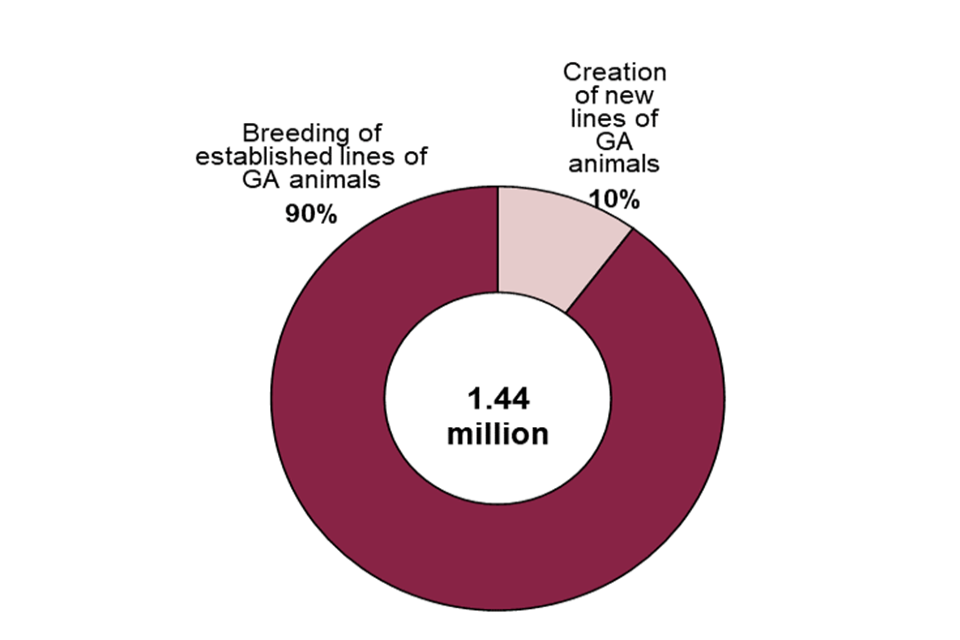 As shown in Figure 14, of the total 1.44 million procedures for the creation and breeding of GA animals, 90% were for the maintenance of already established GA lines, with the remainder of procedures for the creation of new lines.