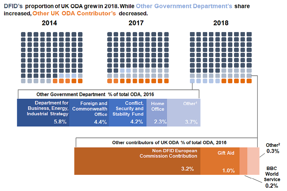- In 2018 the largest non-DFID ‘departmental’ or fund shares of ODA were: Department of Business, Energy & Industrial Strategy (BEIS) (5.8% of ODA); the Foreign and Commonwealth Office (4.4%); the Conflict, Stability and Security Fund (CSSF) (4.2%); and the Home Office (2.3%)