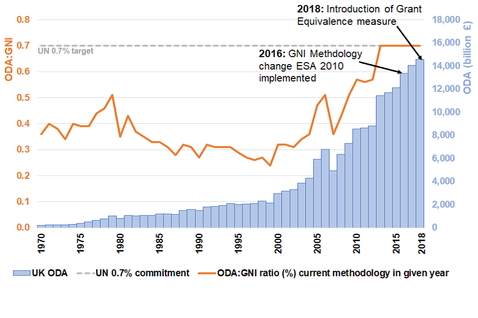 The ODA:GNI target of 0.7% was first agreed internationally in 1970 by the United Nations General Assembly. The UK government made a commitment to invest 0.7% of GNI on ODA from 2013. In 2015, the International Development (Official Development Assistance Target) Act placed the commitment to spend 0.7% of GNI on ODA in UK law from 2015 onwards.