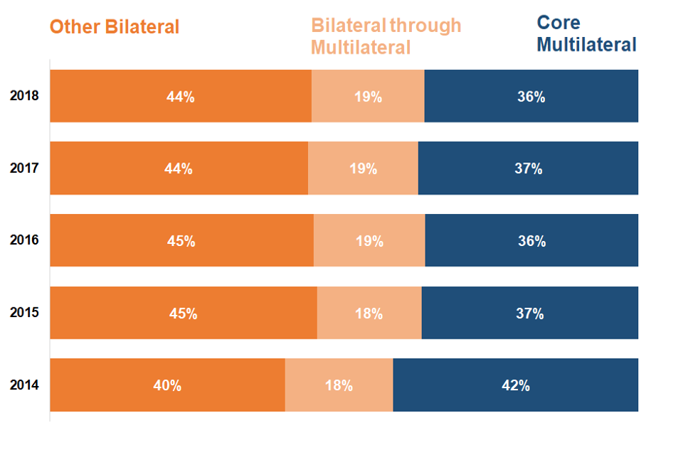Figure 2 presents the breakdown of total ODA by main delivery channel over the last 5 years. Between 2015 and 2018, despite movement in the volumes of bilateral and multilateral ODA, the shares have remained stable at around 63-64% and 36-37% respectively. This in part reflects the variance in core contributions to multilaterals, as the contributions of national governments and the payment schedules of the receiving organisations are managed on different multi-year cycles.