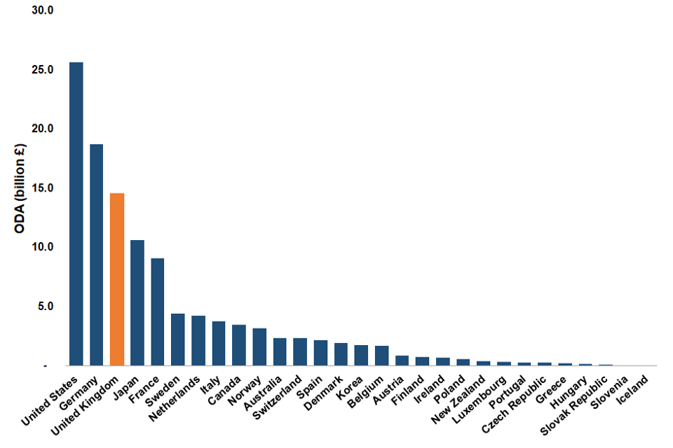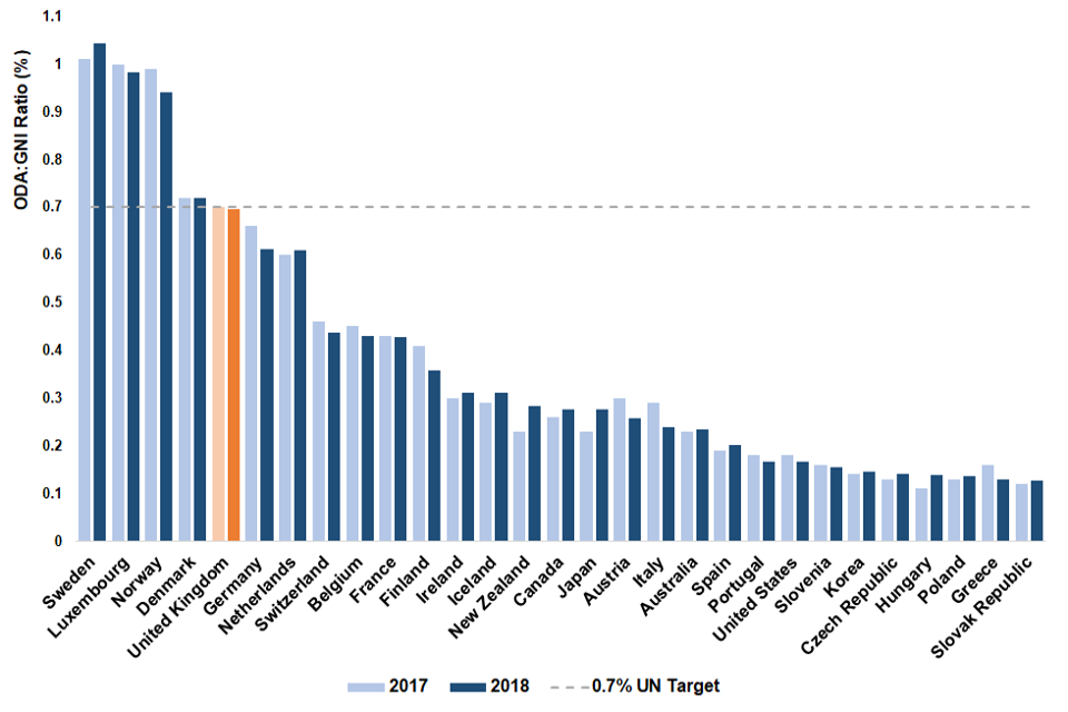 Figure 6 shows ODA spend in terms of gross national income (GNI) in 2018. It highlights that although the United States was the leading DAC donor with £25.7 billion, this represented 0.17% of its GNI. In comparison, Sweden’s ODA spend (£4.4bn) was approximately a sixth of the United States’ but its ODA:GNI ratio was 1.04% showing that Sweden spends a larger share of its national income on ODA.