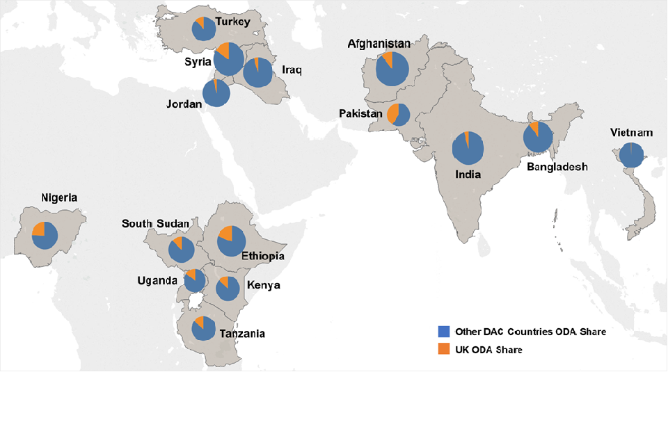 - In 2017, the UK’s share of DAC ODA was 15% or more in a third of the top 15 DAC recipient countries: Ethiopia, Nigeria, Pakistan, Syria and Tanzania. This is similar to 2016