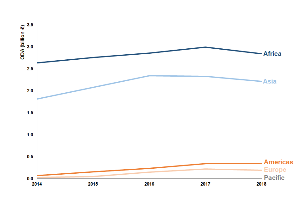 Africa continues to be the region receiving the largest proportion of UK bilateral ODA allocated to a specific country or region (50.6%). This is in line with Africa’s percentage share in 2017 (50.8%), as the reduction in spend specifically to countries or regions in Africa (from £3.0bn in 2017 to £2.9bn in 2018) is proportionate to the overall reduction in country or region specific spend.