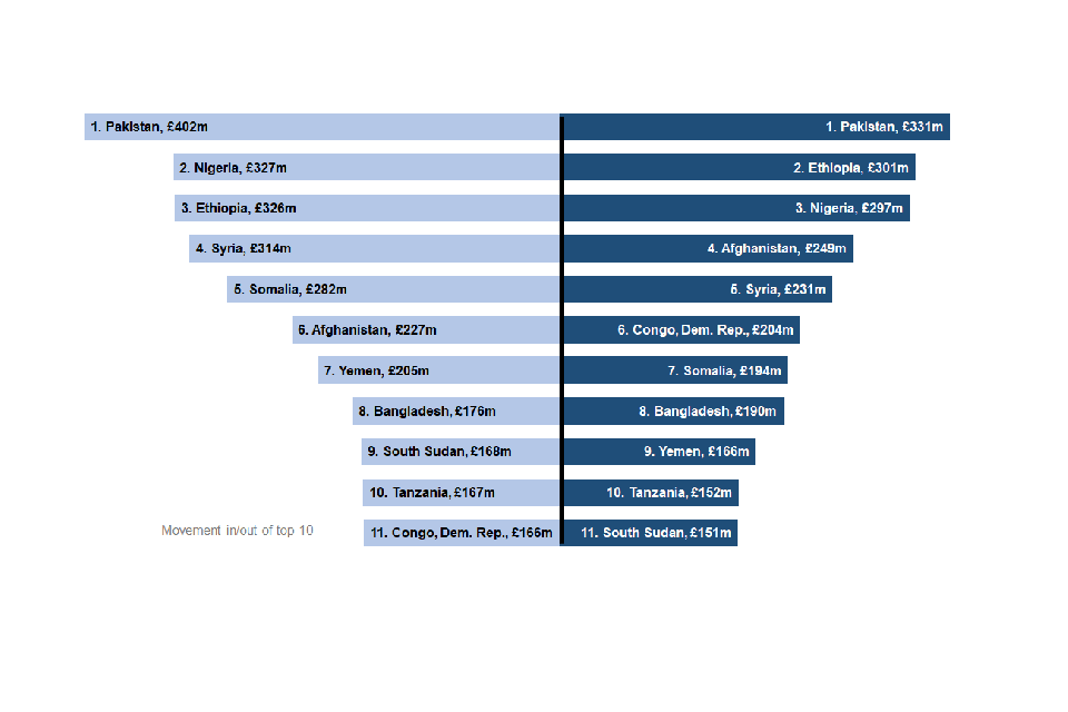 - Afghanistan remains the largest recipient of DAC country member’s ODA totalling £2.2 billion in 2017. Pakistan, which of the top 15 was the recipient of the largest UK share of DAC ODA (41%), fell five places to 15th largest DAC recipient in 2017