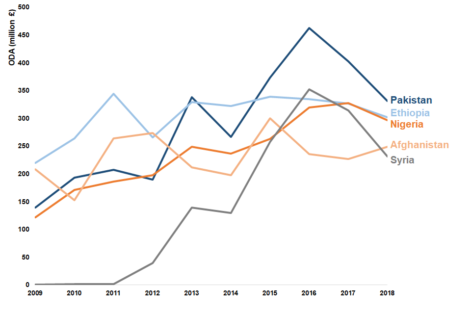 - Of the top 5 DAC recipient countries (Afghanistan, India, Syria, Iraq and Bangladesh), 2 (Syria and Afghanistan) were among the top 5 UK ODA recipients. The remaining top recipients of UK ODA were Pakistan, Ethiopia and Nigeria