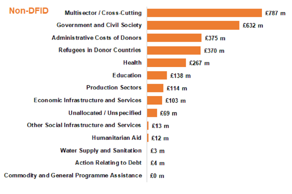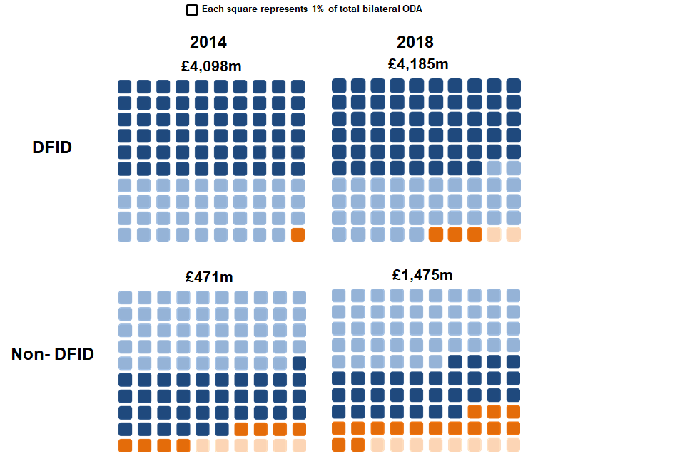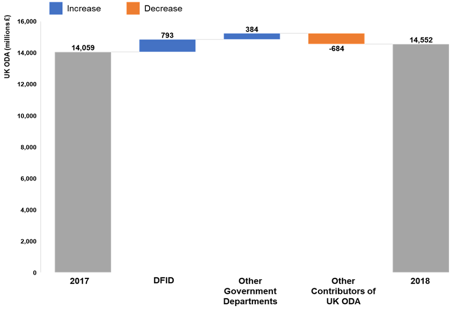 - The reduction in spend by other contributors was partially offset by an increase in spend by non-DFID government departments, which increased by £384 million in 2018. Overall, the non-DFID ODA decreased by £300 million in 2018
