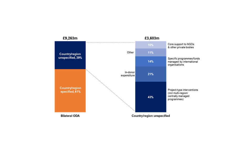 Bilateral ODA is earmarked spend either through multilateral organisations or other delivery partners, compared with multilateral ODA which is un-earmarked funding to multilateral organisations.[footnote 17] Bilateral ODA includes spend to specific countries or regions (sections 3.1.1-3.1.5) as well as spend to multiple countries and/or regions. [footnote 18] Also included is spend within specific sectors for which there are no designated benefitting country or region or where benefitting countries are not known until the end of the programme[footnote 19] (section 3.1.6).