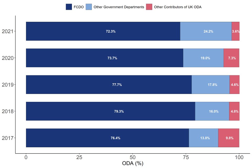 - with former DFID and former FCO having merged, the FCDO is responsible for the majority of the UK ODA budget. In 2021 the FCDO accounted for 72.3% of UK ODA, a slight drop compared to 73.7% in 2020