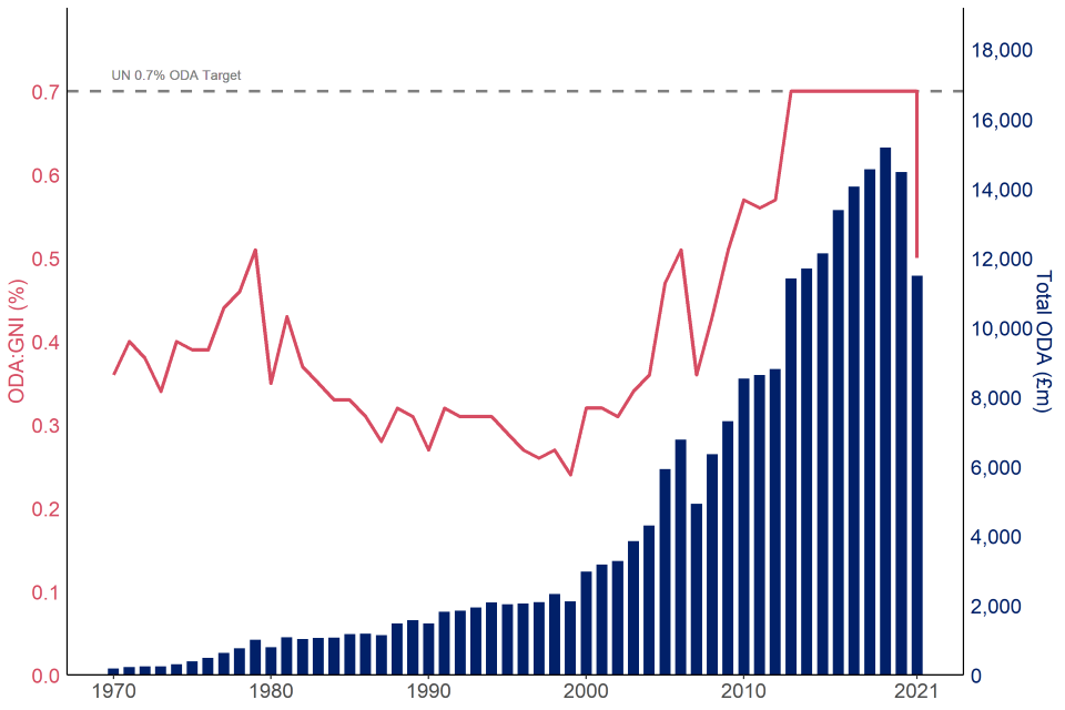 - UK ODA was £11,496 million, a decrease of £2,982 million (20.6%) on 2020.This reflects the reduction in spend from 0.7% in 2020 to 0.5% in 2021
