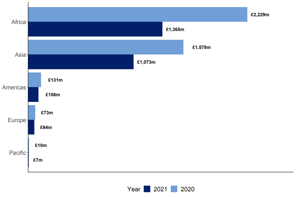 - in 2021, Africa received £1,365 million of FCDO bilateral ODA, a decrease of £864 million from 2020. Africa remained the largest recipient of FCDO country/region-specific bilateral ODA in 2021, despite its share of total country/region-specific bilateral ODA falling from 55.4% in 2020 to 52.2% in 2021