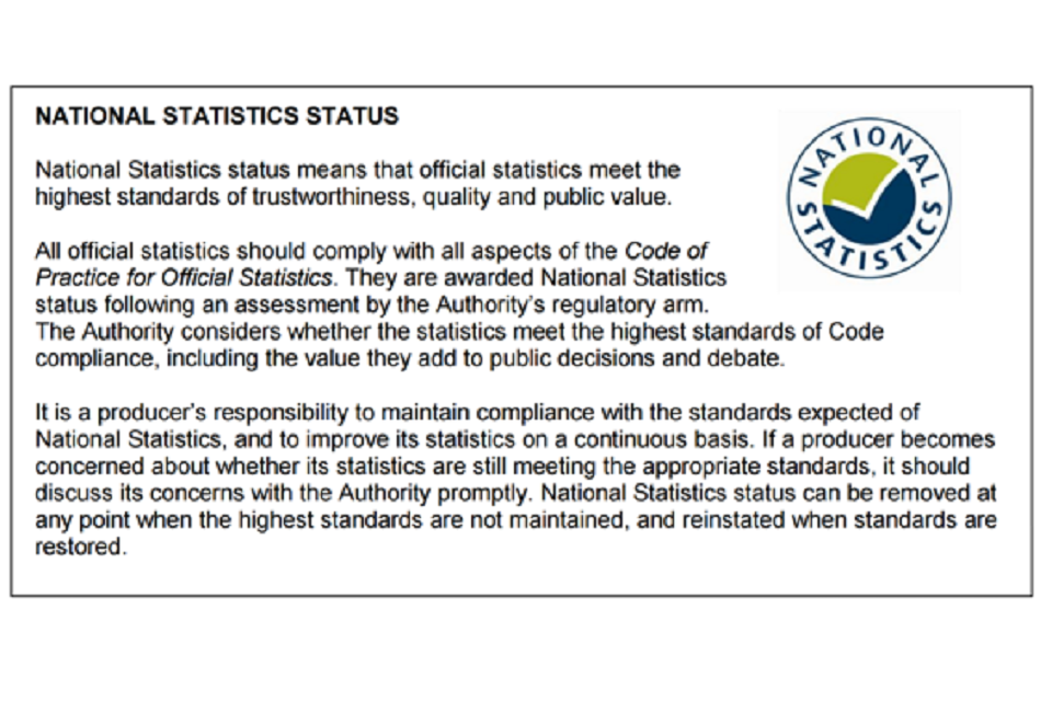 41. The Office for Statistics Regulation (part of the United Kingdom Statistics Authority) designated these statistics as National Statistics in March 2016, in accordance with the Statistics and Registration Service Act 2007 and signifying compliance with the Code of Practice for Statistics. Designation means the statistics carry the National Statistics label and conform to the standards summarised below.