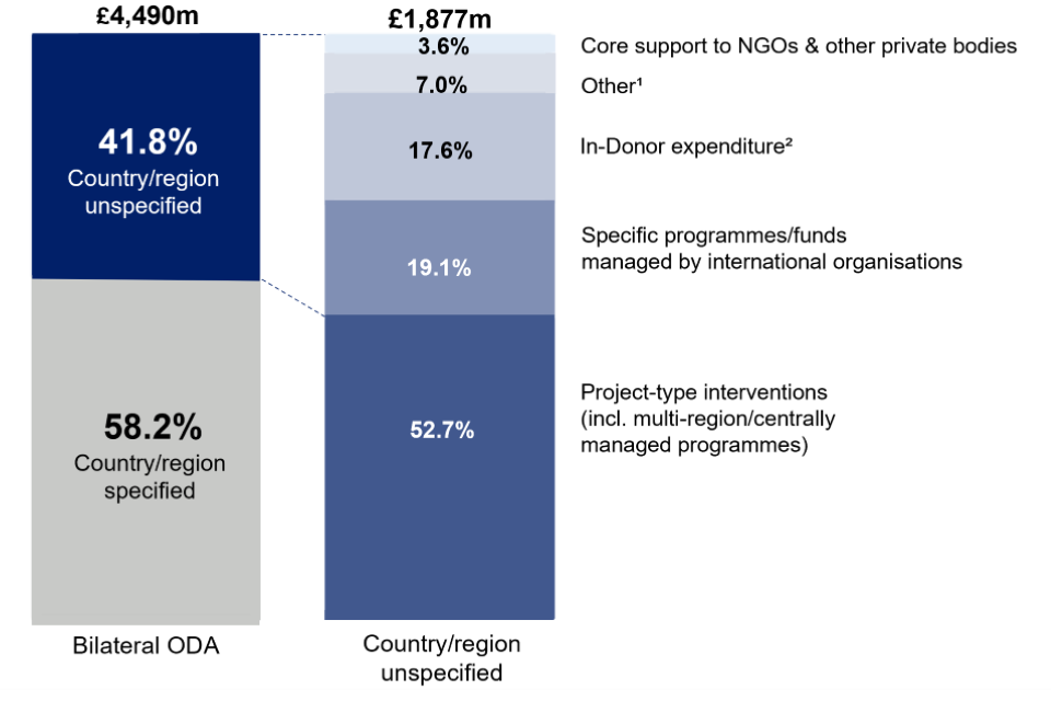 Non-country/region-specific bilateral ODA consists of spend on projects which are not assigned to any single recipient country or region. For example, centrally funded research or programmes which benefit several developing countries and cannot be meaningfully recorded to a single benefitting country or region.