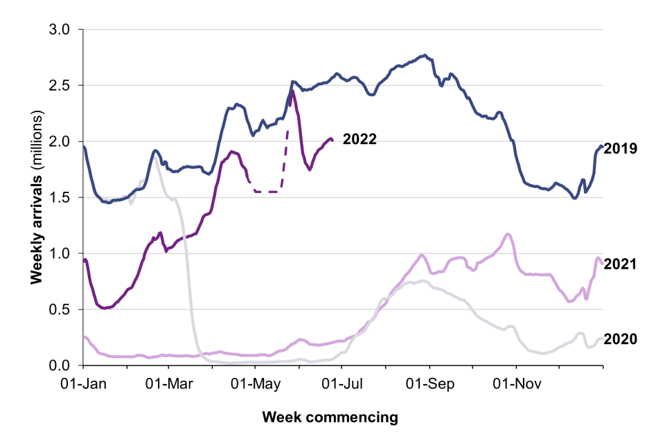 Data on air passenger arrivals for 1st – 24th May 2022 was not available due to a technical issue with the source system. The numbers for this period have been estimated using extrapolation. They were calculated by using the average change in arrivals from April to May and May to June for years 2017, 2018 and 2019 – the most recent years unaffected by the pandemic – and then applying this change to 2022.
