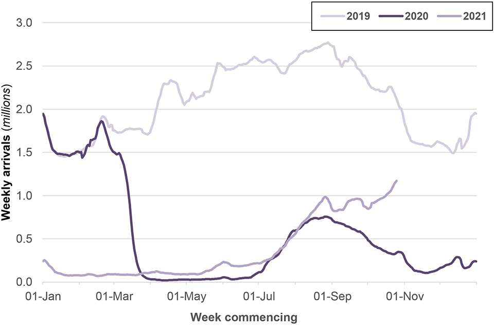 Figure 1 shows that, for the first time since before the first UK lockdown, air passenger arrivals reached over a million per week from mid-to-late October 2021.