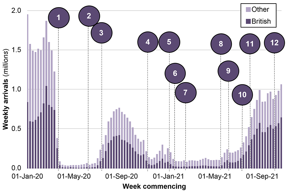 The charts in this report show the key dates which are likely to have had an impact on passenger arrivals to the UK, either through restrictions on travel, or requirements in place for those who do travel.
