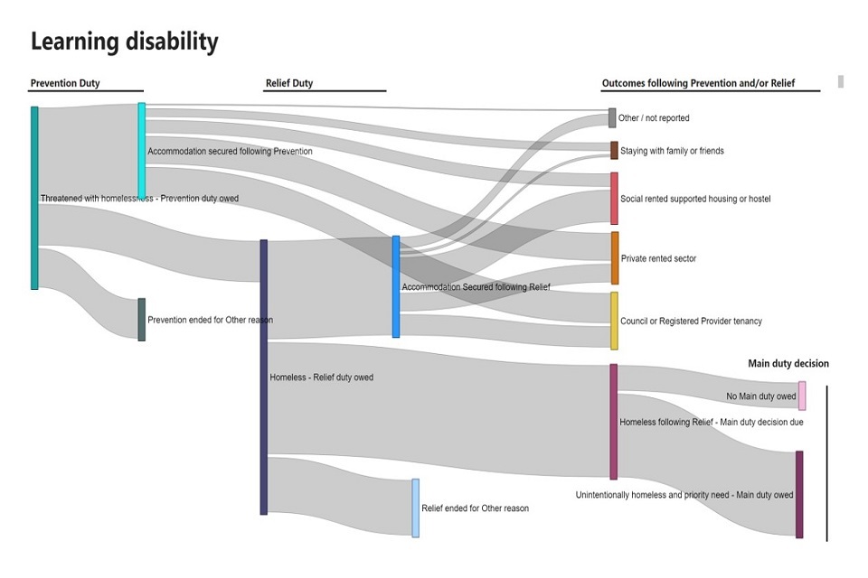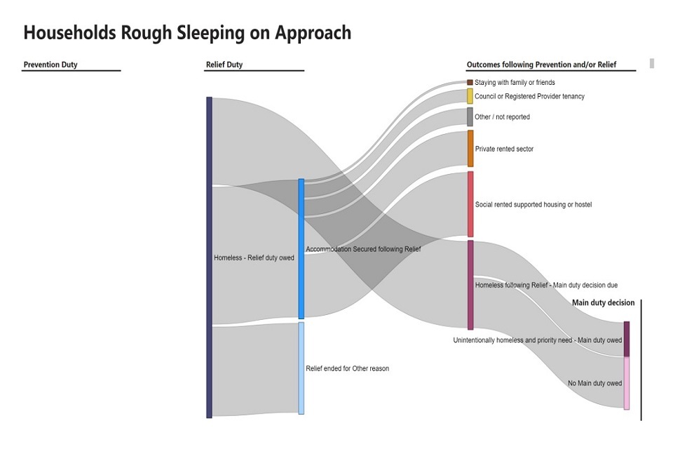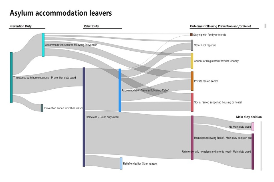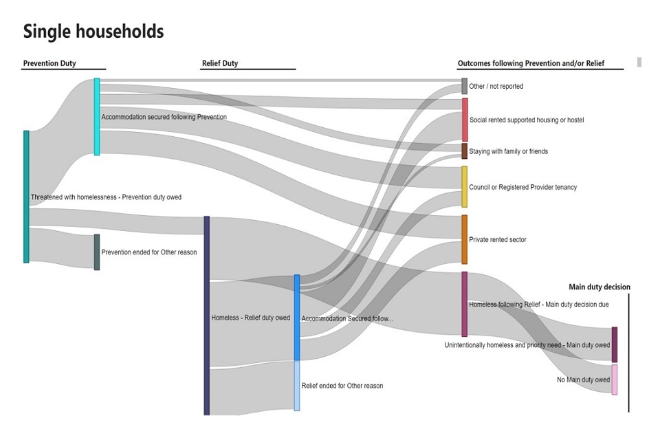 2022-23 Flows dashboard: the flows dashboard was introduced with the 2021-22 annual publication to allow users to more interactively select cohorts of households of interest and follow their journey through the statutory homelessness system. Updates for 2022-23 include the ability to view data for new groups of interest including households required to leave accommodation provided by the home office as asylum support, households with a support need due to physical ill health or disability, and households with a support need due to learning disability.
