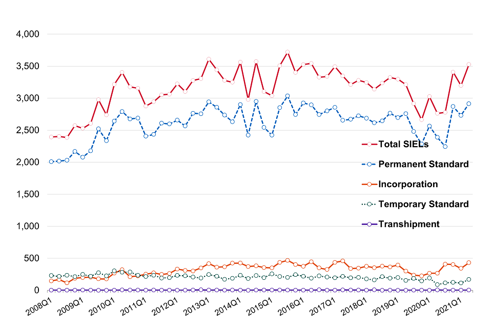 - Between 1 April and 30 June2021, there were a total of 3,593 licensing decisions for Standard Individual Export Licences (SIELs), up 10.0% from 3,266 in the previous quarter.