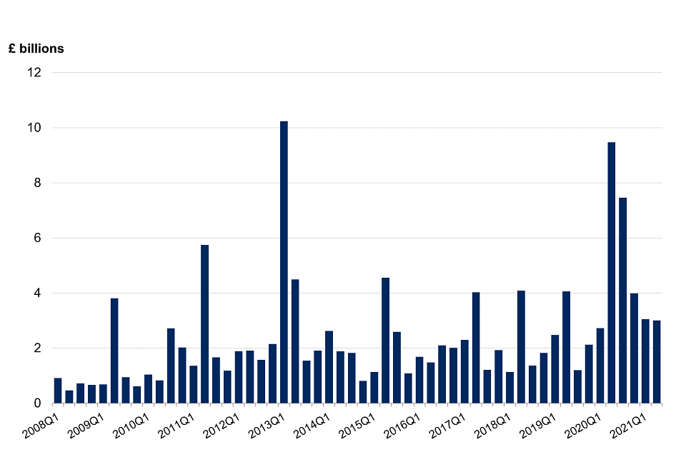 - Noticeable peaks in 2009 Q2, 2011 Q2, 2013 Q1, 2013 Q2, 2015 Q2, 2020 Q2 and 2020 Q3 can be explained by a handful of licences. Around £1.5 billion of the £3.8 billion worth of goods licensed in 2009 Q2 was for combat aircraft to Saudi Arabia. A series of high value licences (between £10 million and £20 million) for equipment employing cryptography to Malaysia, totalling around £615 million, along with a licence to the USA for materials containing enriched and natural uranium, valued at around £575 million also contributed to the 2009 Q2 peak.