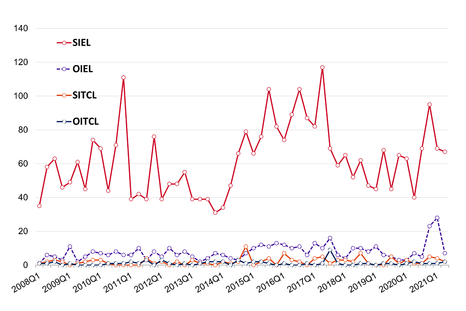 - OIEL revocations peaked in 2014 Q3 (see Table 1), due to 50 revocations to Russia due to restrictions introduced with respect to the Russia-Ukraine conflict. This was accompanied by 25 SIEL revocations to Russia. Again, most SIEL revocations were for permanent standard SIELs.