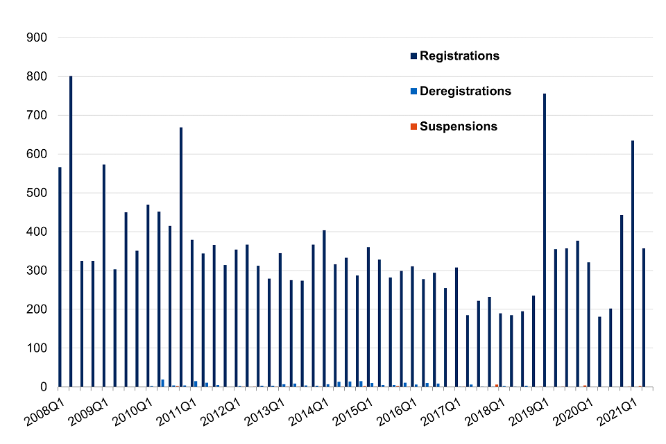 - An increase in registrations in 2020 Q4 is largely due to an increase in registrations for the ‘Export of Dual-Use items to EU Member States’ OGEL, as exporters prepared for the end of the EU transition period. The increase in 2021Q1 is again largely due to registrations for the ‘Export of Dual-Use items to EU Member States’ OGEL but also for the retained General Export Authorisations, all of which came into force at the end of the transition period.