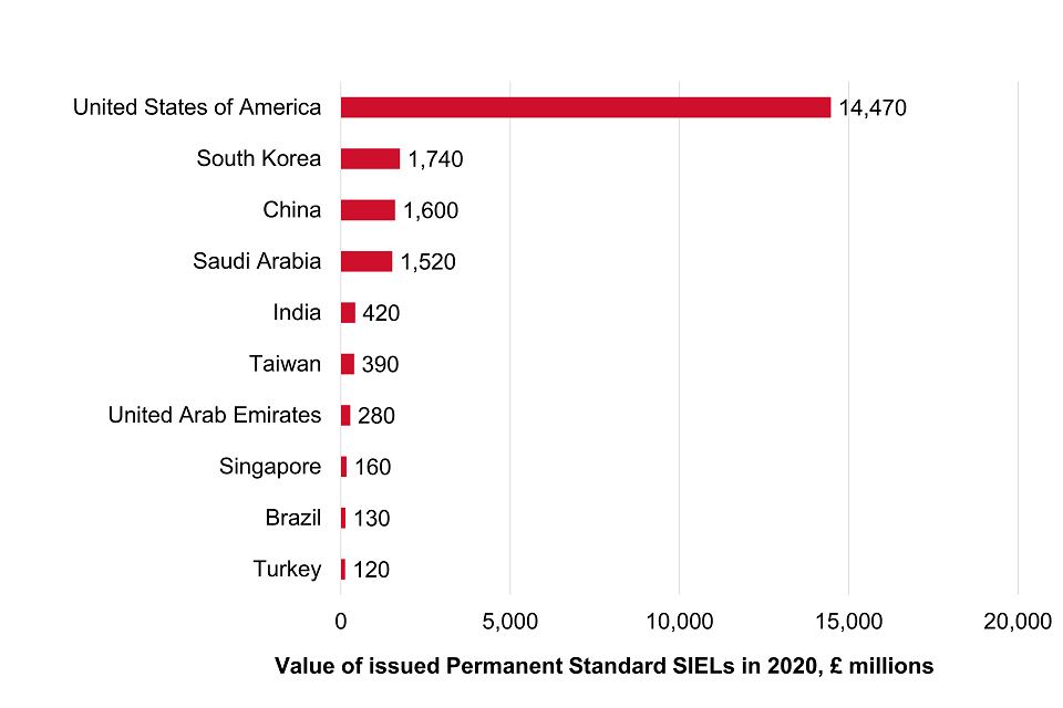 - In 2020, The United States of America was the end user destination with the highest value of licences granted for exportation of strategic goods under ‘Permanent Standard’ SIELs, with licences issued for exportation of £14.5 billion worth of goods (as valued by applicants). The next end users with the highest value of licences issued for goods were South Korea (£1.7 billion) and China (£1.6 billion).