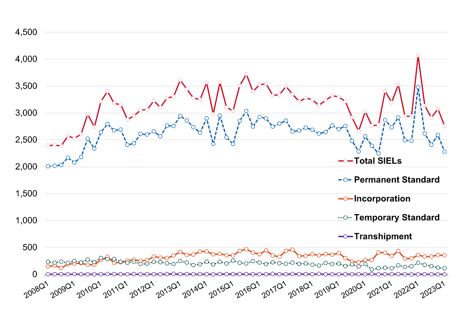 In 2023 Q1, 2,758 SIELs were issued. This was the lowest number of SIELs issued since 2019 Q4. There was a combination of factors during 2023 Q1 that impacted upon ECJU’s ability to process licences. These factors included the ongoing impact of transitioning from our existing digital service (SPIRE) to a new digital licensing service (LITE) and the increased workload caused by the added complexity in considering cases following the Military End Use Control refresh in May 2022