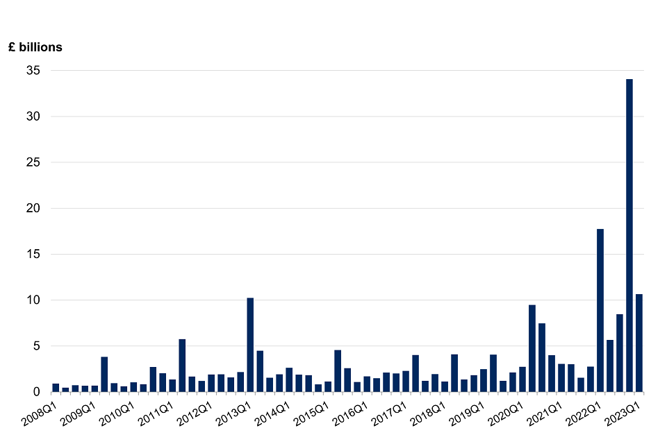 Noticeable peaks in 2009 Q2, 2011 Q2, 2013 Q1, 2013 Q2, 2015 Q2, 2017 Q2, 2018 Q2, 2020 Q2, 2020 Q3, throughout 2022, and in 2023 Q1 can be explained by a handful of licences. Around £1.5 billion of the £3.8 billion worth of goods licensed in 2009 Q2 was for combat aircraft to Saudi Arabia. A series of high value licences (between £10 million and £20 million) for equipment employing cryptography (secure communications techniques) to Malaysia, totalling around £615 million, along with a licence to the USA for materials containing enriched and natural uranium, valued at around £575 million also contributed to the 2009 Q2 peak