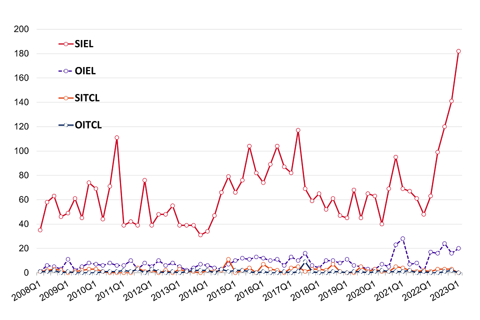 OIEL revocations peaked in 2014 Q3, due to 50 revocations to Russia due to restrictions introduced with respect to the Russia-Ukraine conflict. This was accompanied by 25 SIEL revocations to Russia. Again, most SIEL revocations were for permanent standard SIELs