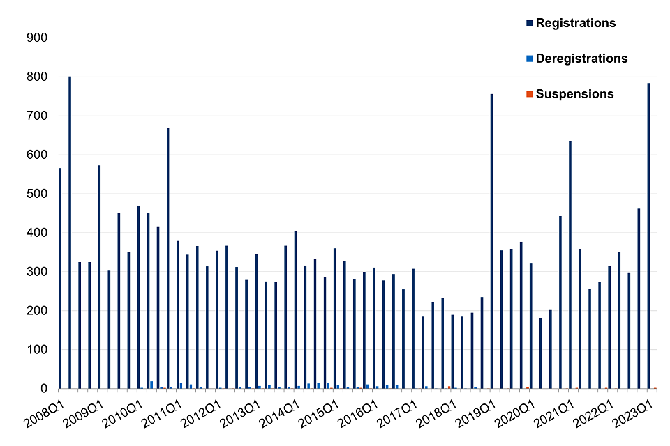- On the 30 September 2022, ECJU re-instated the ability to register for and use 26 OGELs. When these 26 open general licences were originally locked, preventing further registration, ECJU created a set of parallel open general licences with fewer permitted destinations. These parallel OGELS were no longer required and were revoked on 30 December 2022. The increase in registrations in 2023 Q1 was mainly due to Exporters being required to register for the 26 OGELS which were now available, and which replaced those that were revoked. Further information on these can be found in the Notices to Exporters, NTE 2022/25 and NTE 2022/34