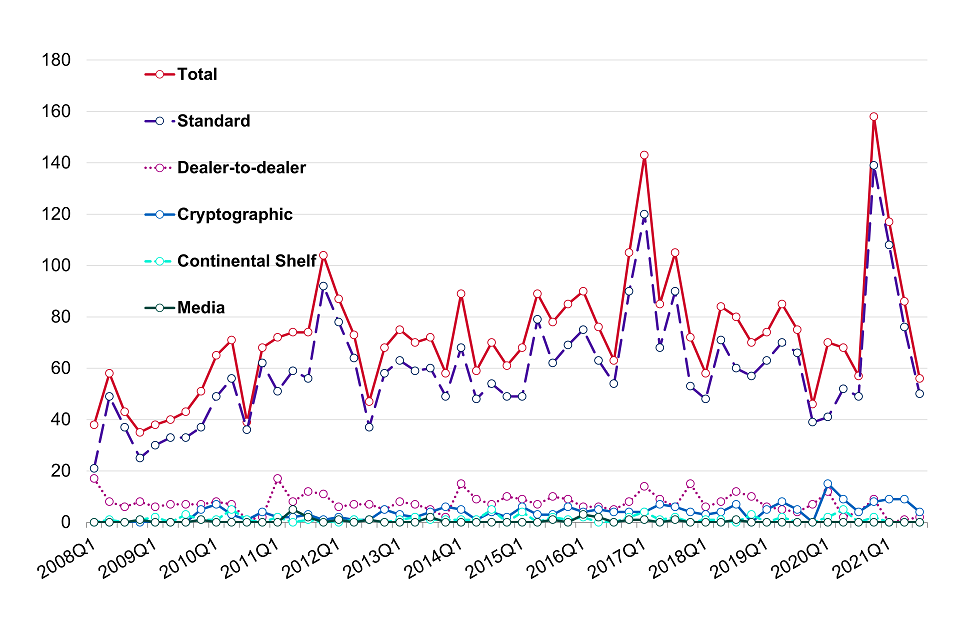 - OGEL registrations were fairly consistent from 2011 Q2 until a peak in 2019 Q1. This was primarily due to a new OGEL that became available for registration on 1 February 2019 for export of dual-use items to EU member states. Although this OGEL would not come into force until the end of the transition period, the ECJU encouraged advance registrations to ensure continuity for exporters. Peaks are also seen in 2010 Q4, largely due to registrations to the ‘Military Goods, Software and Technology’ OGEL and in 2008 Q2, partly due to relatively large numbers of registrations to the ‘Technology for Military Goods’ and ‘Military Goods, Software and Technology: Government or NATO End-Use’ OGELs, but partly due to above average registrations across a number of other OGELs.