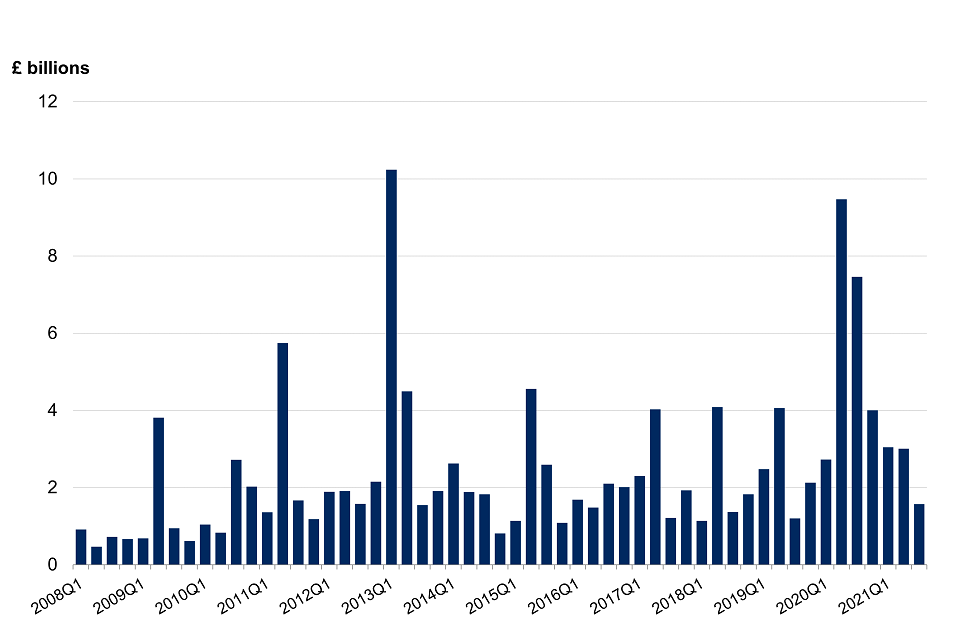 - Noticeable peaks in 2009 Q2, 2011 Q2, 2013 Q1, 2013 Q2, 2015 Q2, 2017 Q2, 2018 Q2, 2020 Q2 and 2020 Q3 can be explained by a handful of licences. Around £1.5 billion of the £3.8 billion worth of goods licensed in 2009 Q2 was for combat aircraft to Saudi Arabia. A series of high value licences (between £10 million and £20 million) for equipment employing cryptography to Malaysia, totalling around £615 million, along with a licence to the USA for materials containing enriched and natural uranium, valued at around £575 million also contributed to the 2009 Q2 peak.