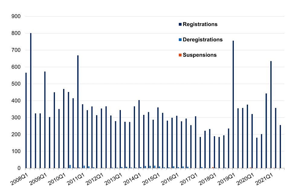 - An increase in registrations in 2020 Q4 is largely due to an increase in registrations for the ‘Export of Dual-Use items to EU Member States’ OGEL, as exporters prepared for the end of the EU transition period. The increase in 2021Q1 is again largely due to registrations for the ‘Export of Dual-Use items to EU Member States’ OGEL but also for the retained General Export Authorisations, all of which came into force at the end of the transition period.