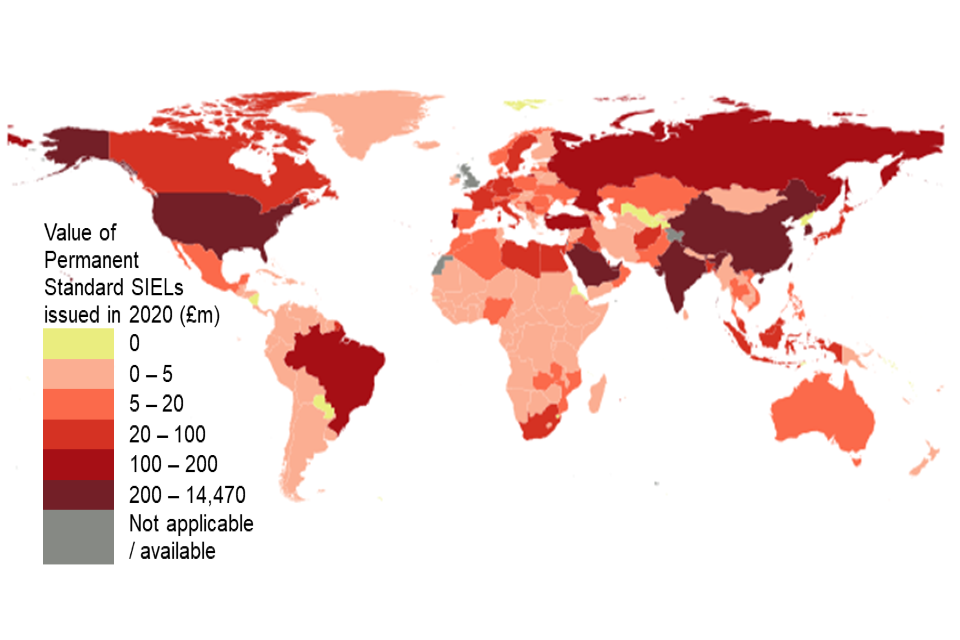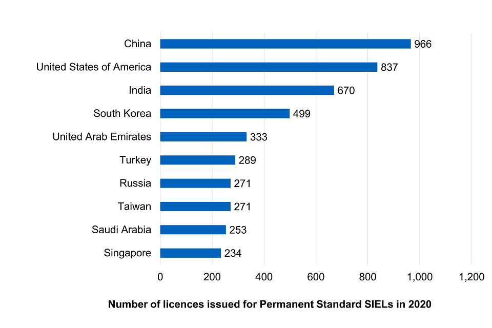 - In 2020, The United States of America was the end user destination with the highest value of licences granted for exportation of strategic goods under ‘Permanent Standard’ SIELs, with licences issued for exportation of £14.5 billion worth of goods (as valued by applicants). The next end users with the highest value of licences issued for goods were South Korea (£1.7 billion) and China (£1.6 billion).