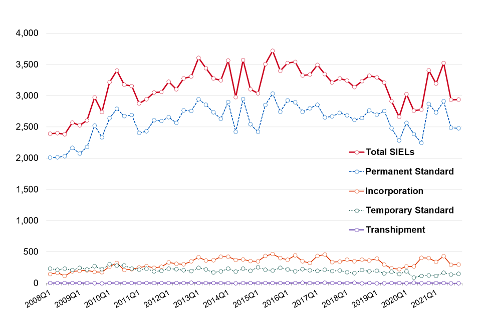 - The decrease from 3,526 SIELs issued in 2021 Q2 to 2,937 in 2021 Q3 and 2,939 in 2021 Q4 is likely to be explained by a decrease in applications submitted, and operational reasons, specifically a temporary shortage in resourcing.