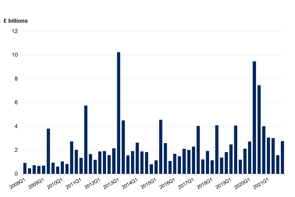 - Noticeable peaks in 2009 Q2, 2011 Q2, 2013 Q1, 2013 Q2, 2015 Q2, 2017 Q2, 2018 Q2, 2020 Q2 and 2020 Q3 can be explained by a handful of licences. Around £1.5 billion of the £3.8 billion worth of goods licensed in 2009 Q2 was for combat aircraft to Saudi Arabia. A series of high value licences (between £10 million and £20 million) for equipment employing cryptography to Malaysia, totalling around £615 million, along with a licence to the USA for materials containing enriched and natural uranium, valued at around £575 million also contributed to the 2009 Q2 peak.