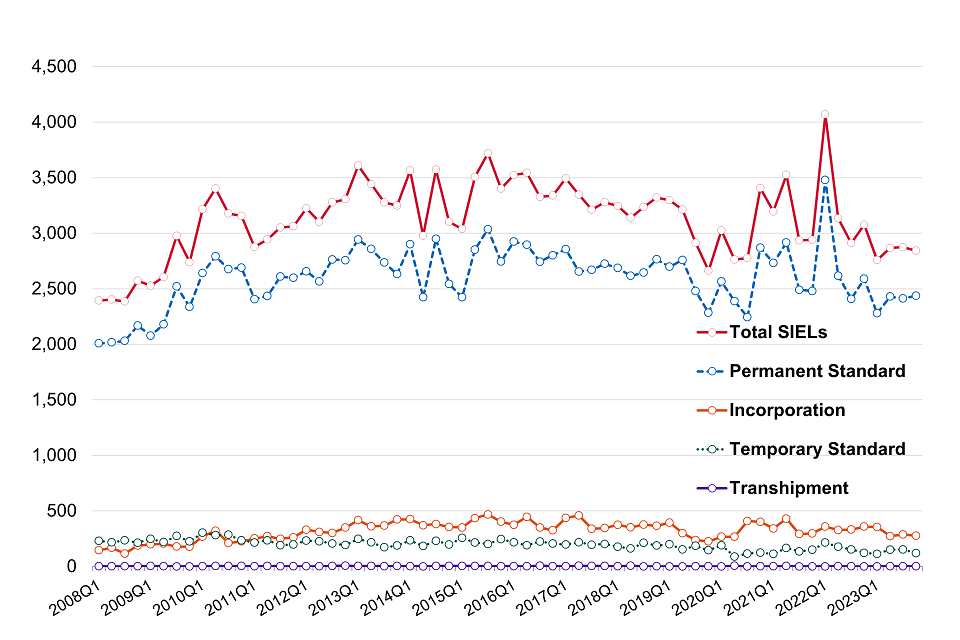 In 2023 Q1, 2,758 SIELs were issued. This was the lowest number of SIELs issued since 2019 Q4. From 2023 Q2 – 2023 Q4, volumes of issued SIELs surpassed the volumes of SIELs issued for 2023 Q1, but remained below levels previously seen in each quarter throughout 2020 to 2022. There was a combination of factors during 2023 that impacted upon ECJU’s ability to process licences. These factors included the ongoing impact of transitioning from our existing digital service (SPIRE) to a new digital licensing service (LITE) and the increased workload caused by the added complexity in considering cases following the Military End Use Control refresh in May 2022
