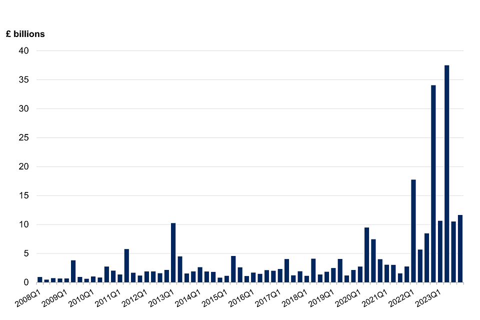 In 2023 Q3, 13 high value licences for China, India and South Korea accounted for over 82% of the total value of all SIELs issued in that quarter. These licences, valued at £8.6 billion, were for information security equipment and software for information security equipment