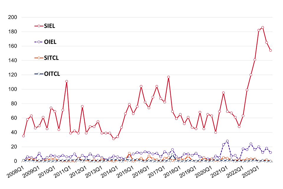 The numbers of SIELs and SITCLs refused and OIELs and OITCLs rejected tend to be much lower than the numbers issued (see Chart 4). The number of SIELs refused in each quarter between 2008 Q1 and 2023 Q4 has averaged 71 but more recent periods have seen higher numbers of refusals, with each quarter since 2022 Q3 surpassing 100 total refusals. Notable historic trends in refusals have been highlighted in the commentary for previous publications. More recent notable trends are summarised below