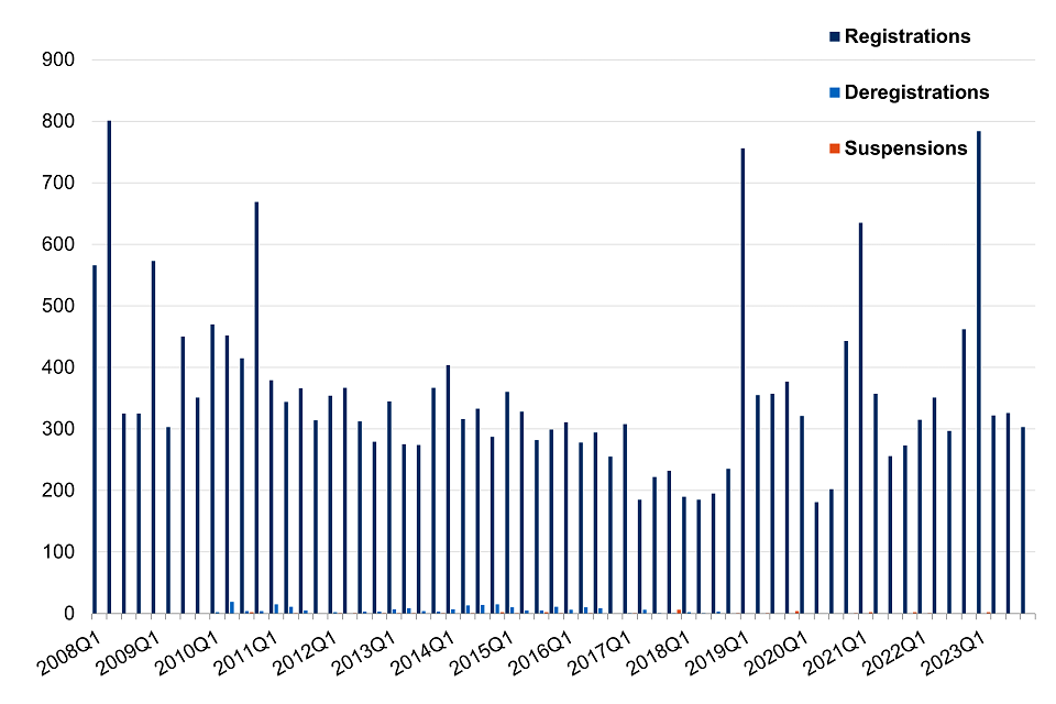 Notable historic trends in registrations have been highlighted in previous publications. More recent notable trends are summarised below