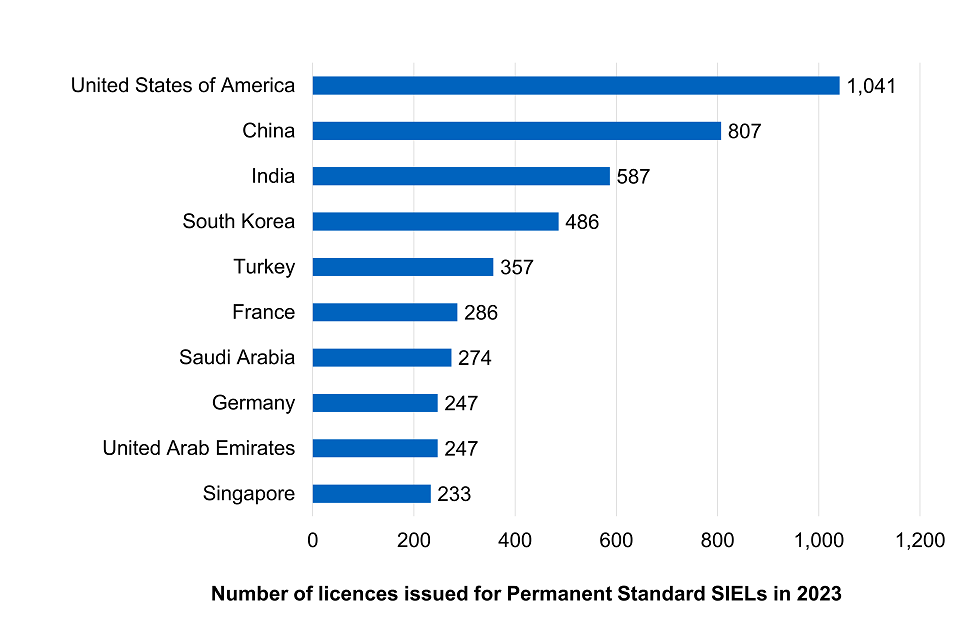 In 2023, China was the end user destination with the highest value of licences issued for exportation of strategic goods under ‘Permanent Standard’ SIELs, with licences issued for exportation of £25.6 billion worth of goods (as valued by applicants). The next end users with the highest value of licences issued for goods under Standard SIELs were South Korea (£13.1 billion) and India (£8.4 billion). Goods are valued by the licence applicant, and not all goods licensed are actually exported.