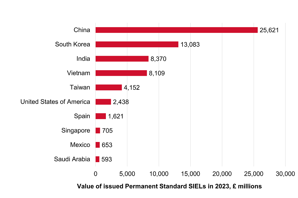 In 2023 Q4, 10 high value licences for China, India, South Korea and Taiwan accounted for over 70% of the total value of all SIELs issued in that quarter. These licences, valued at £8.1 billion, were for information security equipment and software for information security equipment