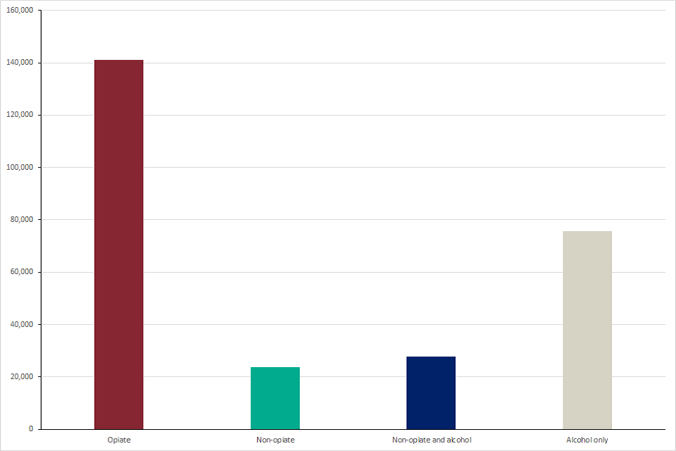 Graph showing the numbers of people in alcohol and drug treatment in 2017 to 2018 for the 4 main substance groups