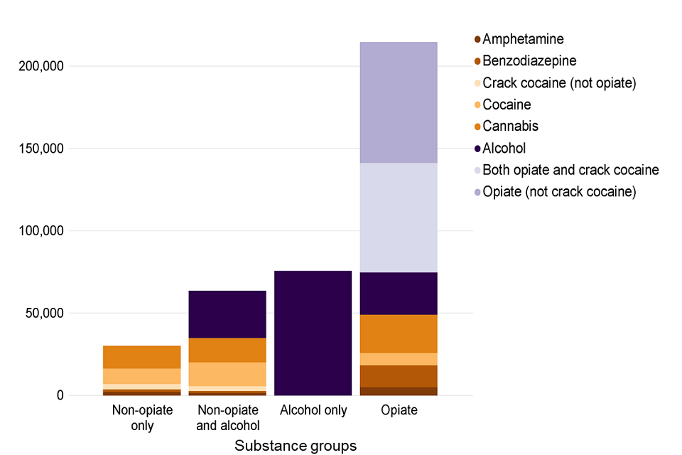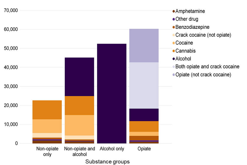 A bar chart showing the number of people in treatment in each of the 4 substance groups split by substances mentioned at the start of treatment.