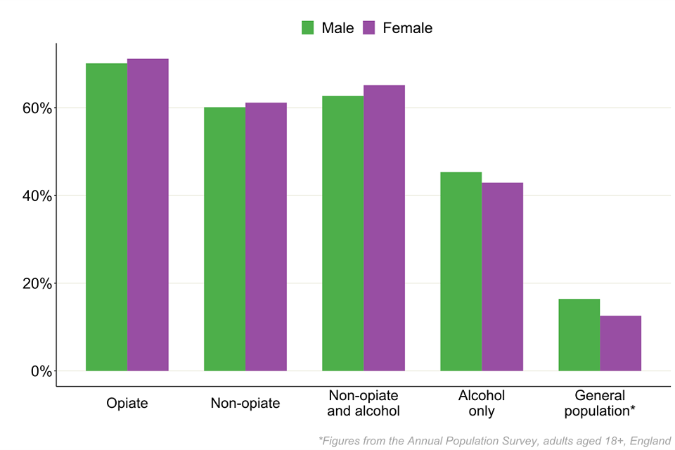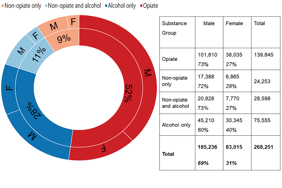 Nearly three-quarters of people in treatment for opiates were male, which was similar to the non-opiate drugs groups. But 40% of people with alcohol only problems were female.