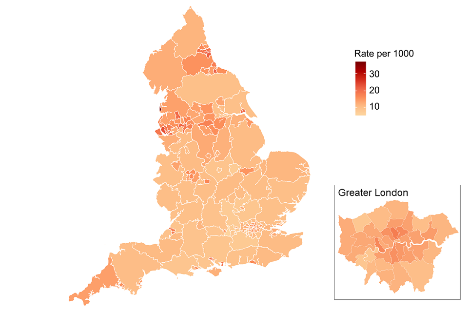 Similar to the opiate and crack prevalence rates, the higher prevalence rates are concentrated in the north of England.