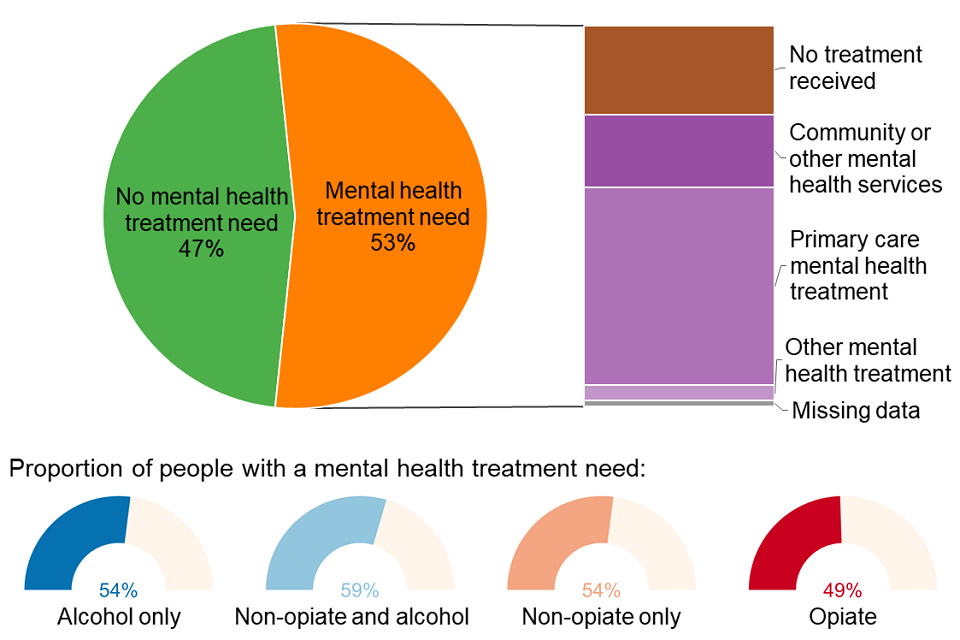 Over half (53%) of adults starting treatment said they had a mental health treatment need, ranging from 49% for people with opiate problems to 59% for people with non-opiate and alcohol problems.