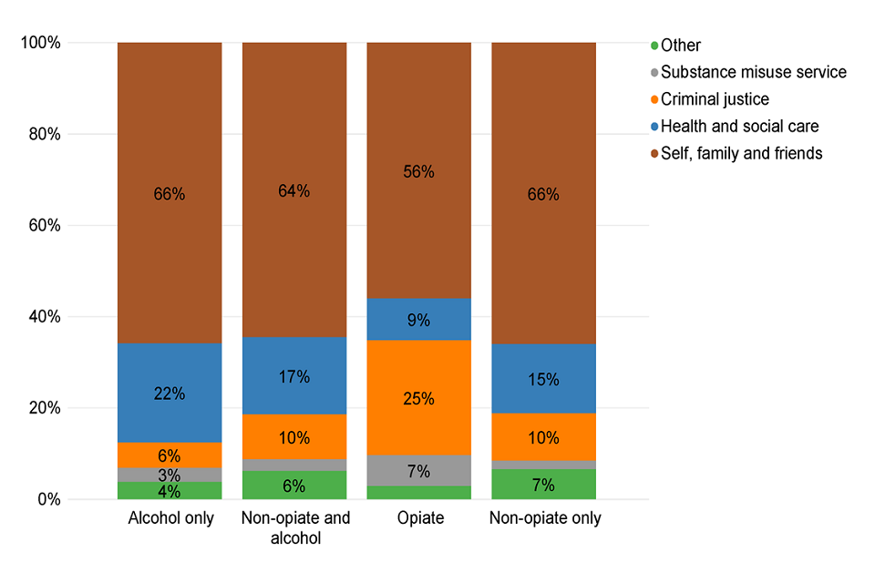 Bar chart of people starting treatment split by substance group and referral source.